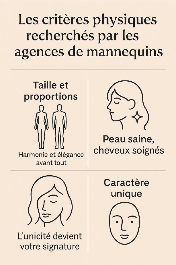 La taille est l’un des critères les plus discutés. Pour les défilés, une hauteur minimum de 1,75 m pour les femmes et 1,85 m pour les hommes est souvent requise. Toutefois, la mode évolue et de plus en plus d’agences s’ouvrent à diverses morphologies. L’important est d’avoir des proportions harmonieuses qui permettent de sublimer les vêtements présentés.